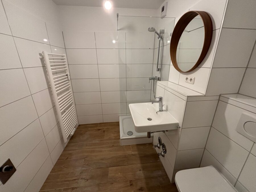 - Badezimmer mit modernen Fliesen und Handtuchheizkörper