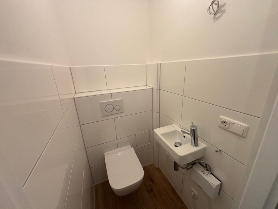 - Badezimmer mit modernen Fliesen und Handtuchheizkörper
