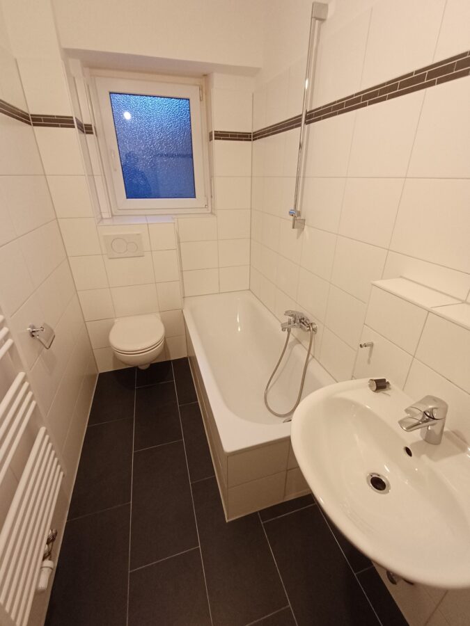 - Badezimmer mit Fliesen und Badewanne